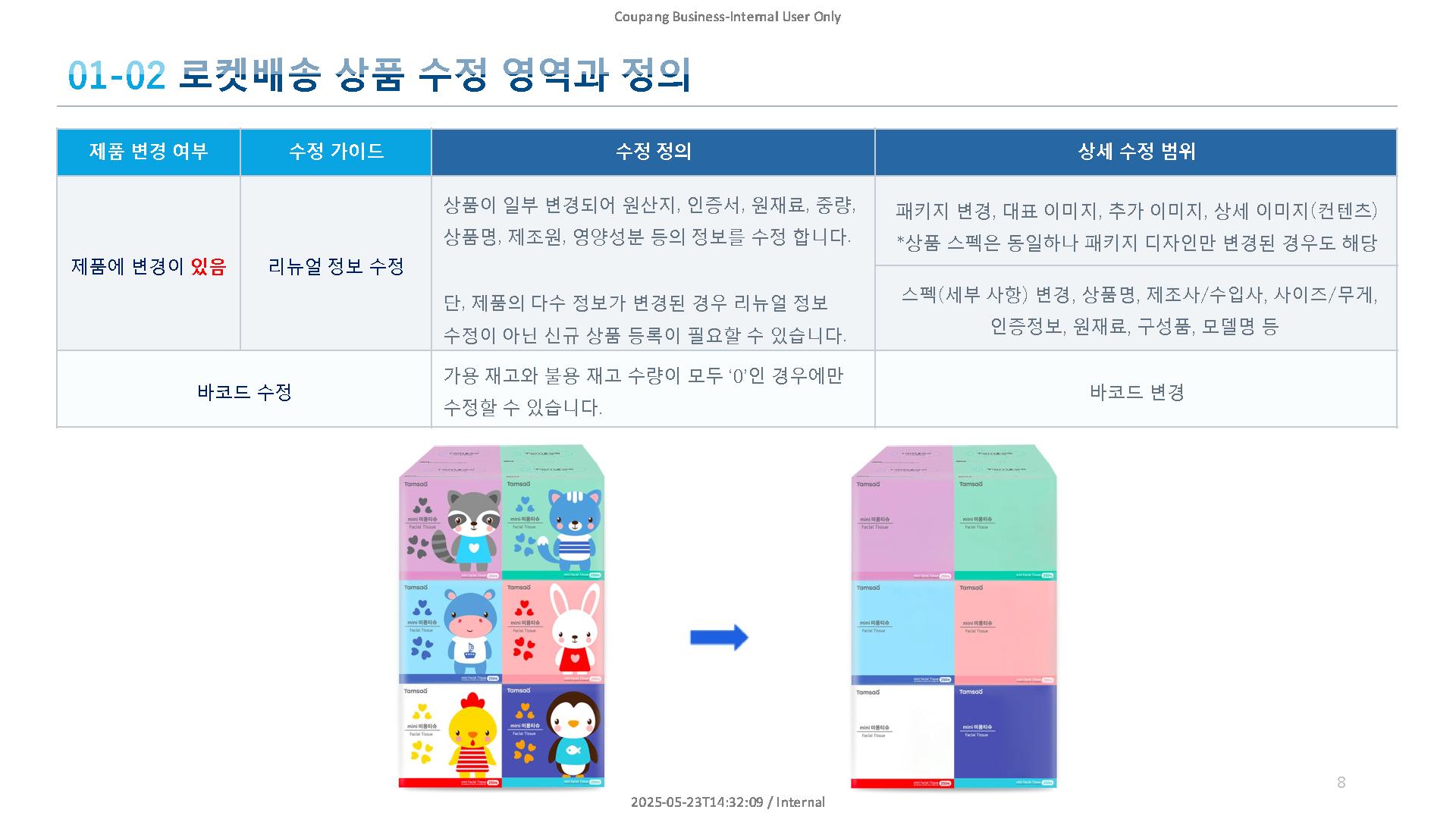 | 예시 | 이미지 개선, 텍스트 수정, 옵션명 변경 | 패키지 변경, 성분·무게 변경 |