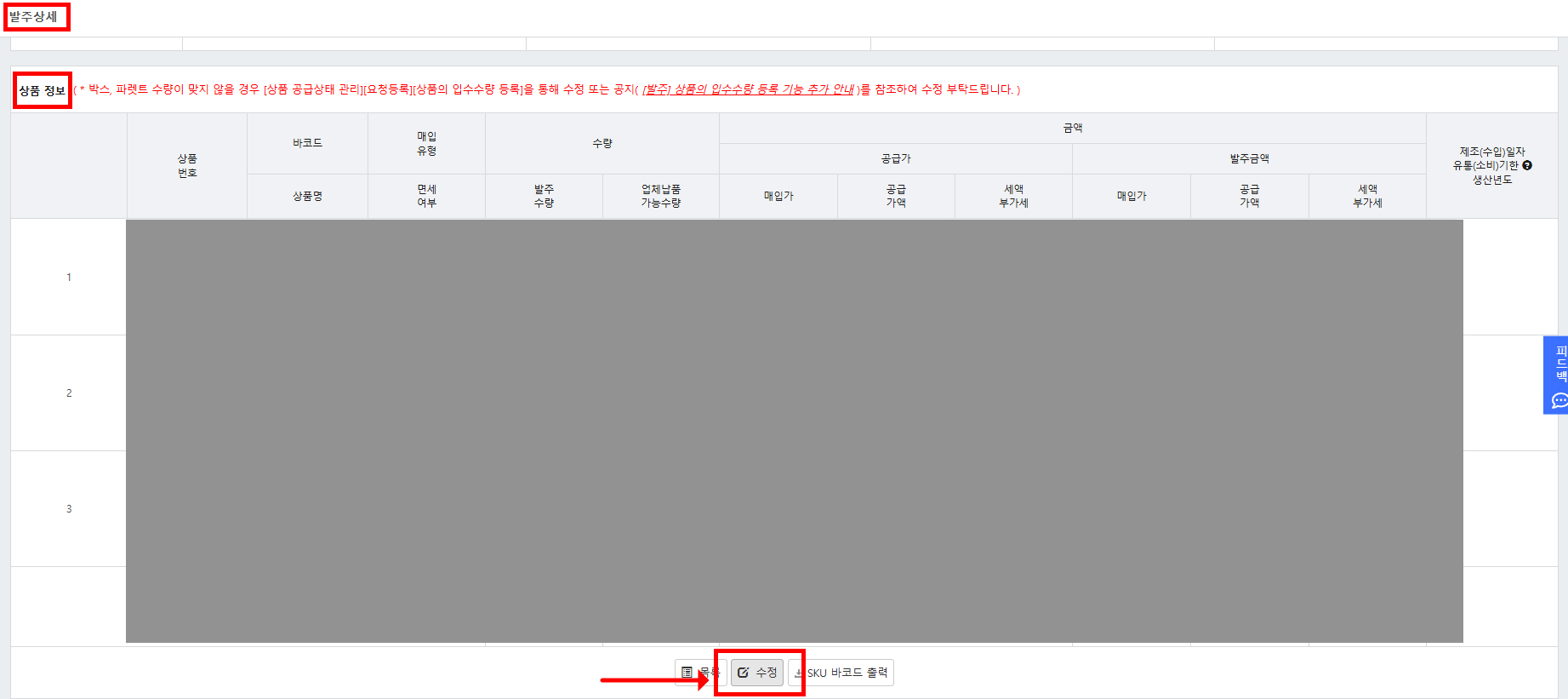 • 입고수량변경, 발주확정 모두  → 수정 버튼 클릭