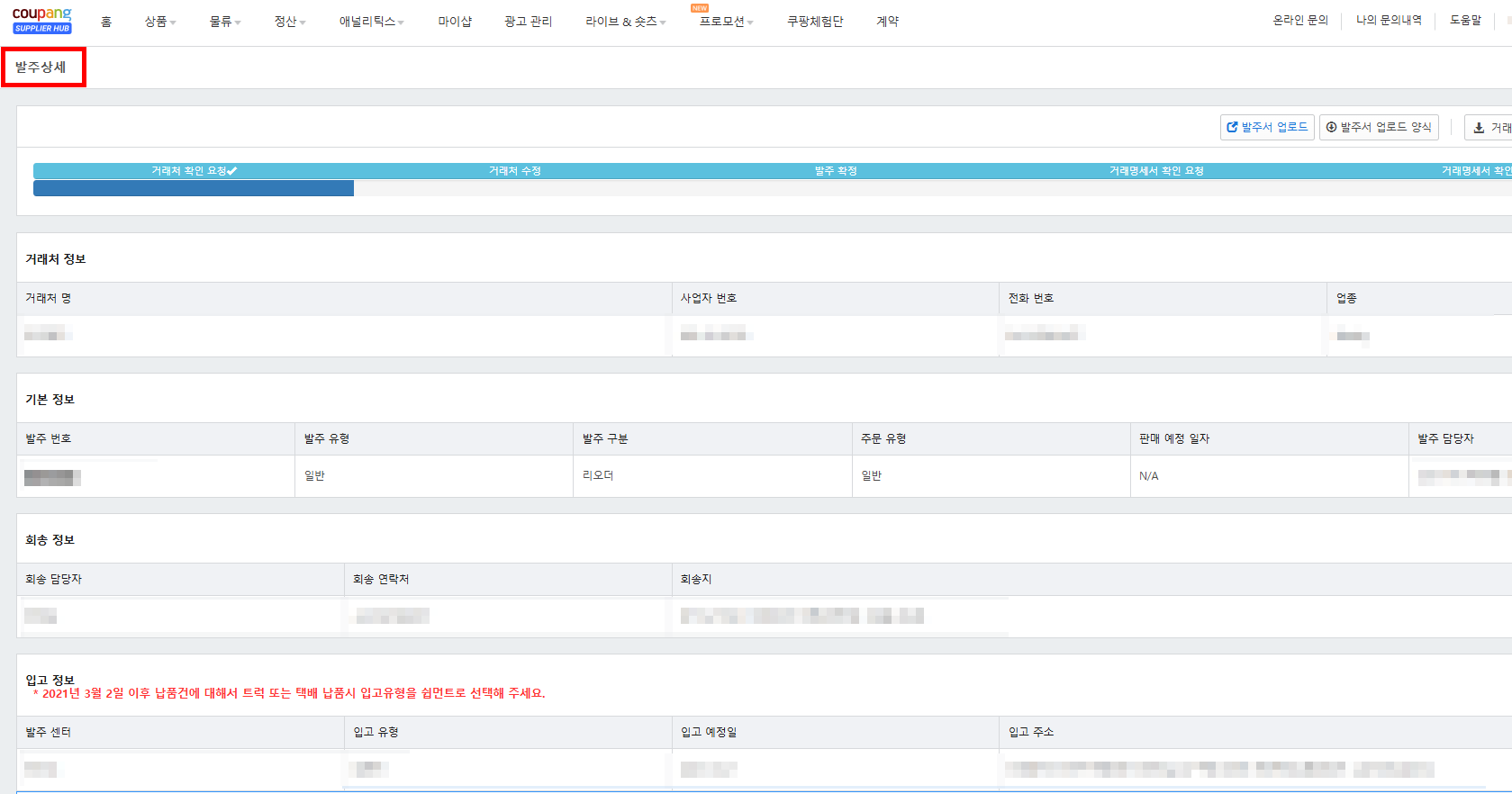 💡 Tip: 발주확정 이후에는 상품, 수량, 입고정보를 수정할 수 없습니다.