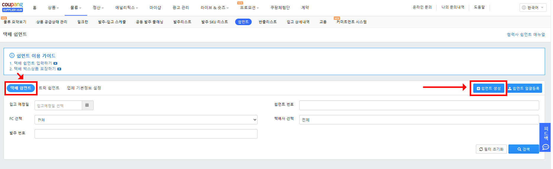 쿠팡 로켓셀러에서 초도발주 발주확정하기를 완료했다면, 이제 실제 납품을 위한 택배 쉽먼트 생성 단계가 필요합니다.