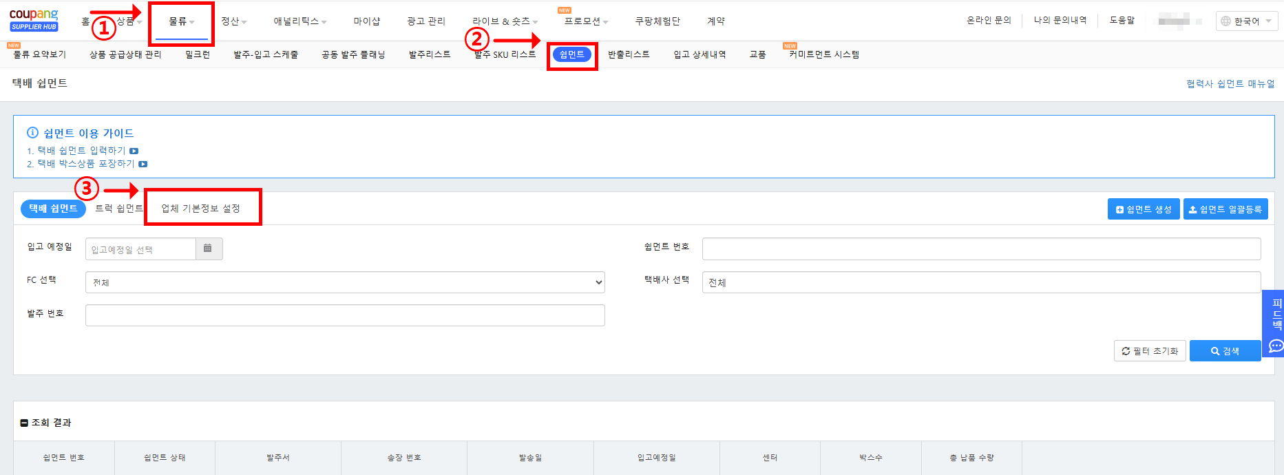 - 쿠팡서플라이어허브 로그인 → ①물류 → ②쉽먼트→ ③업체 기본정보 설정 →④출고지추가 →⑤출고지 정보생성
