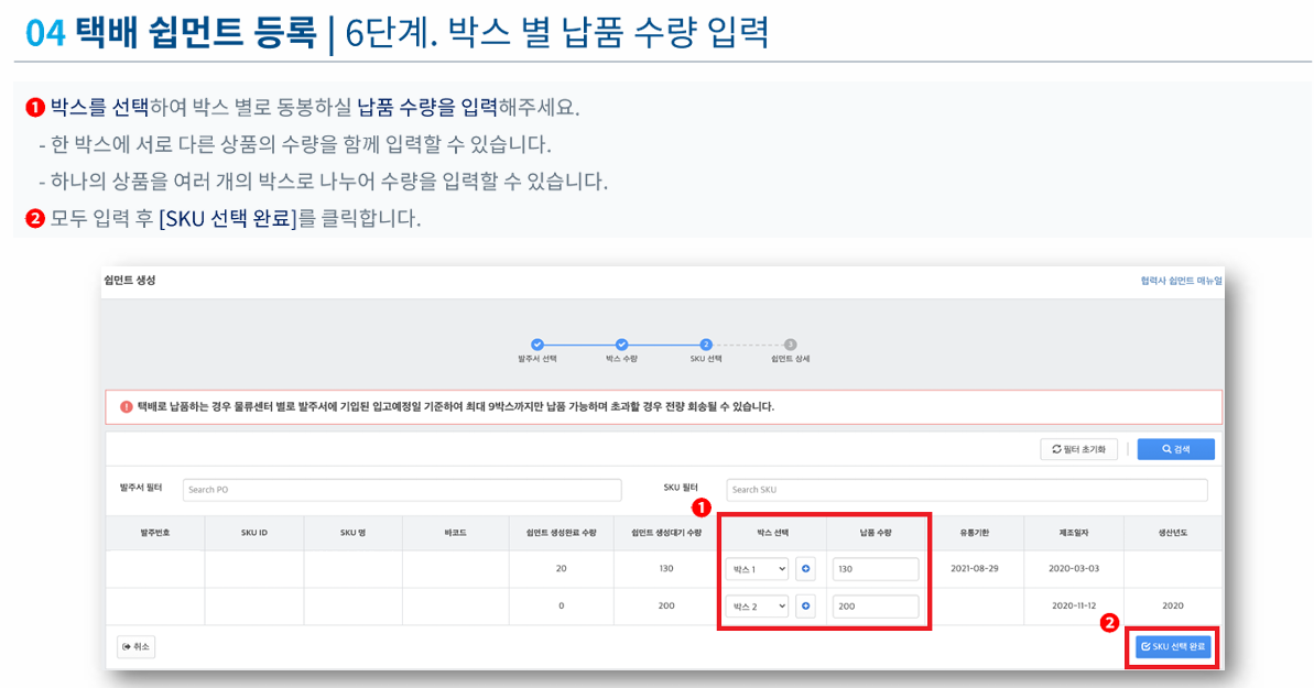 - 보낼 박스 순서를 정하고 박스1, 박스2 를 구분해서 몇 개씩 납품수량이 들어가는지 입력해줍니다.
